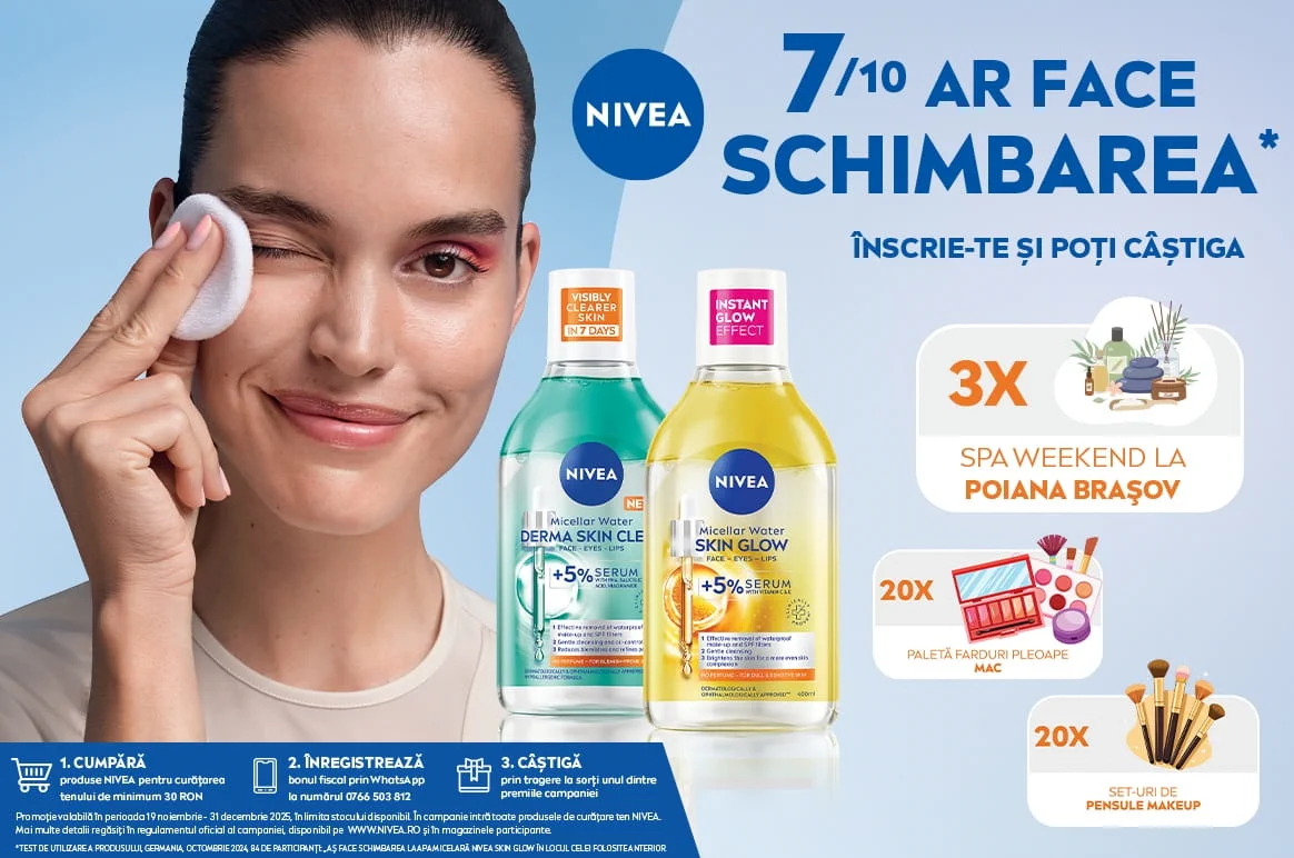 🎯 Cum Participi - Cumperi orice produs de curățare a tenului NIVEA în valoare de minimum 30 RON din magazinele DM (fizic sau online) în perioada 19.11 – 31.12.2025. Trim bonul fiscal prin WhatsApp la 0766 503 812 cu o fotografie clară, lizibilă, care conține numărul, data și numele magazinului. Păstrezi bonul original pentru validare. 🎁 Premii 3 x Weekend Spa Poiana Brașov – Hotel Alpin 4*, 2 persoane (3.038 RON) 20 x Trusă make-up MAC (330 RON) 20 x Set pensule Cucuta Makeup Angel’s Noir Touch – Travel Edition (350 RON) Valoarea totală a premiilor: 28.154 RON (TVA inclus).